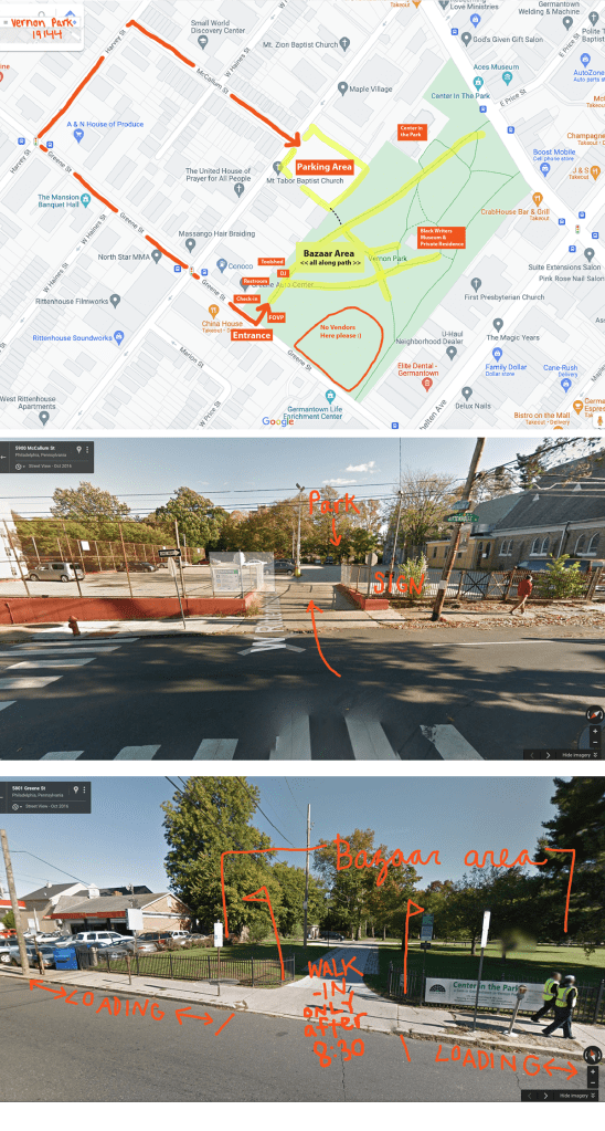 Please note: for safety reasons, no cars will be permitted to enter the park after 8:30 a.m. People are walking around. If you arrive late please park in the upper lot parking area and load in that way, or along Greene St if space is available.